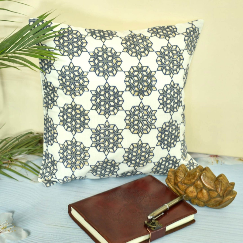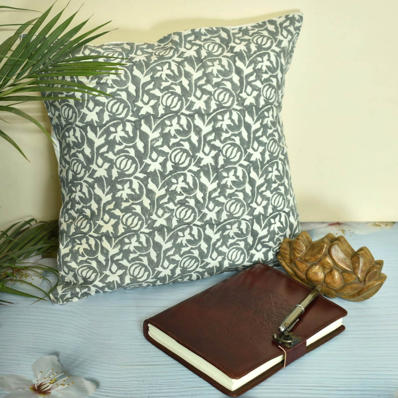 Hand Block Cotton Grey-White Cushion Cover |Farmhouse Pillow Cover|Boho |Floral Throw pillow cover
